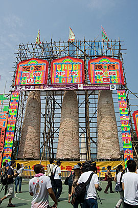 Three large, and many smaller, towers are built out of bamboo and covered with lucky steamed buns. It is these buns that give the festival its name and the buns are both an important local product and also highly symbolic. The bun towers are erected outside Pak Tai temple during the run up to the parade day, which is actually the third day of the festival.